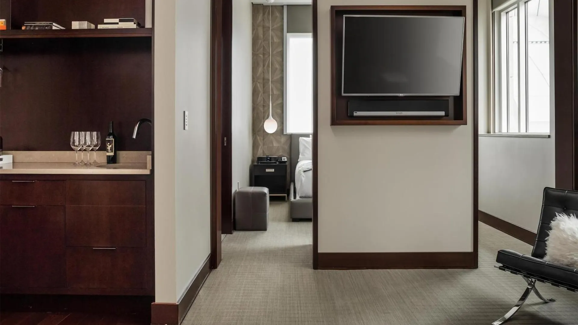 Some of the air-conditioned rooms of Conrad Indianapolis Hotel face the garden, and comprise a seating area and a dining area. They are outfitted with elegant decor.